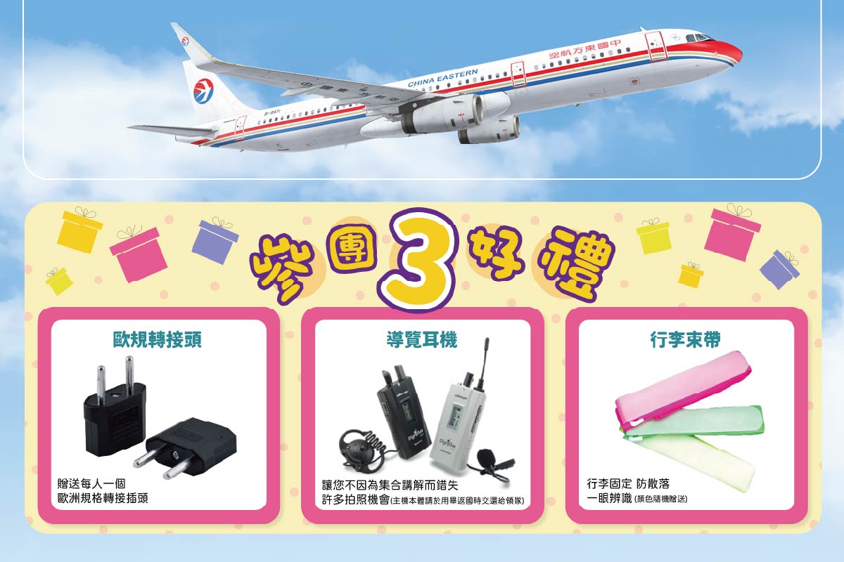 特別安排: 1. 安排搭乘中國東方航空~說中文嘛ㄟ通。 2. 全程提供個人導覽耳機,不受外界干擾凝聽專業導遊領隊解說。 3. 再送行李束帶每人一條、歐規轉接插頭每人一個。