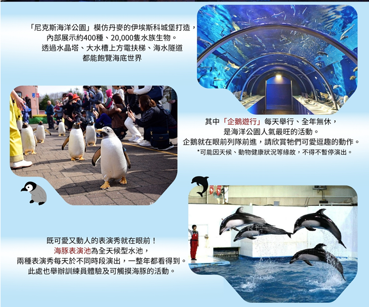 【登別海洋公園尼克斯】主要以丹麥的耶斯克城為藍圖興建而成的尼克城,走在水中隧道,魚兒們就在遊客的頭頂上游來游去,就像走在海底般光影交錯的水中夢幻園,在此魚兒優雅游來游去的水中迴廊,每處都是多采多姿的海中世界。城的四周都是北歐式的街景,還可以看到可愛的海豚精采的表演、國王企鵝遊行、街頭藝人演出等。