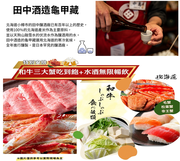 早餐:飯店日.西式早餐 午餐:日式竹筴魚+小火鍋套餐 或日式風味套餐 晚餐:三大螃蟹吃到飽+和牛涮涮鍋吃到飽+水酒無限暢飲 (80分鐘)