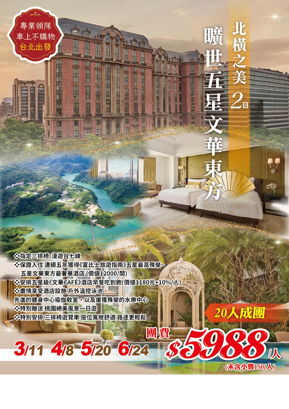 包含項目:遊覽車車資,飯店早餐,全程住宿2人1室,250萬旅遊責任險+20萬意外醫療險