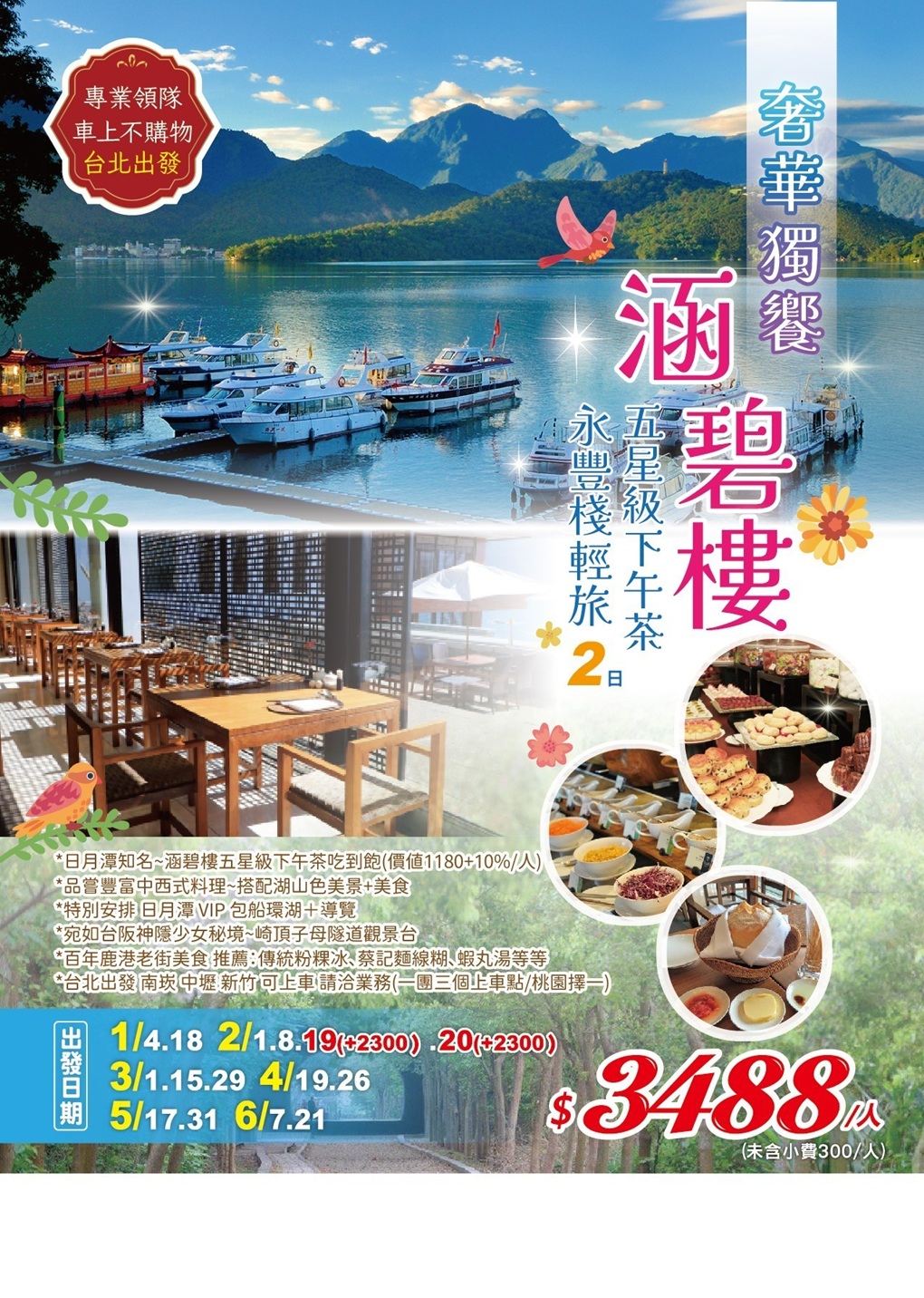 台北車站預計8:00出發~日月潭 VIP 包船環湖+導覽~三大碼頭(水社+玄光寺+伊達邵)停靠觀光~涵碧樓下午茶~酒店~步行5分鐘至精明一街商圈