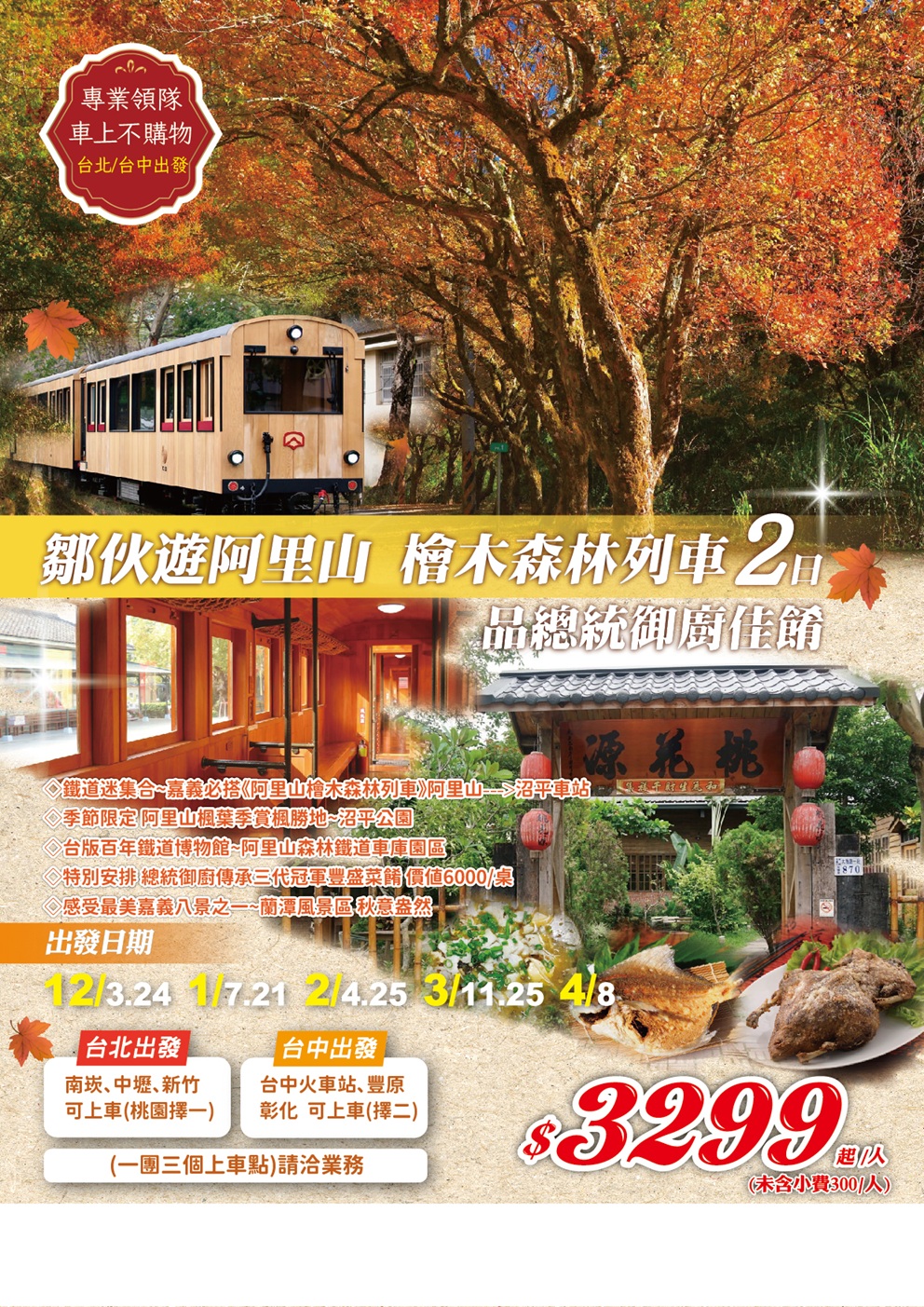 沼平公園賞楓~步行約5分鐘前往文化夜市 阿里山國家森林遊樂區擁有森林小火車、神木、雲海、日出與晚霞「五奇」景致, 是台灣最具知名、也最受歡迎的森林遊樂區,是阿里山山脈上的一枚翡翠,閃著耀眼的 光芒。