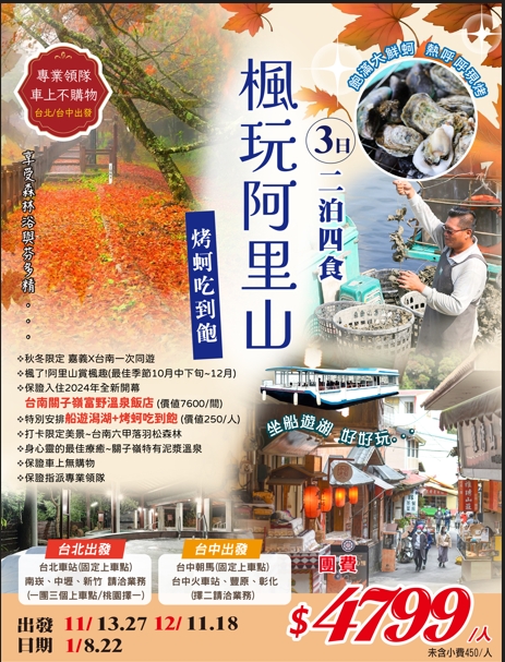 【備註】依天候因素影響花況可能提早或延後,花的變化速度無法完全掌握。如遇天候變化因素(下雨.颳風 或氣 溫 高低變化..)可能花會提早凋謝或尚未盛開,我們仍依原行程前往景點純欣賞,敬請諒解。