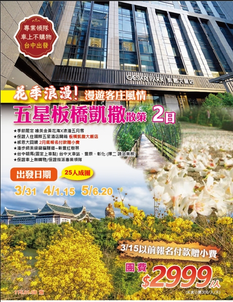【備註】依天候因素影響花況可能提早或延後,花的變化速度無法完全掌握。如遇天候變化因素(下雨.颳風 或氣溫高低變化..)可能花會提早凋謝或尚未盛開,我們仍依原行程前往景點純欣賞,敬請諒解。