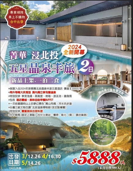 台中出發~菁華·浸北投 五星晶泉丰旅一泊二食2日