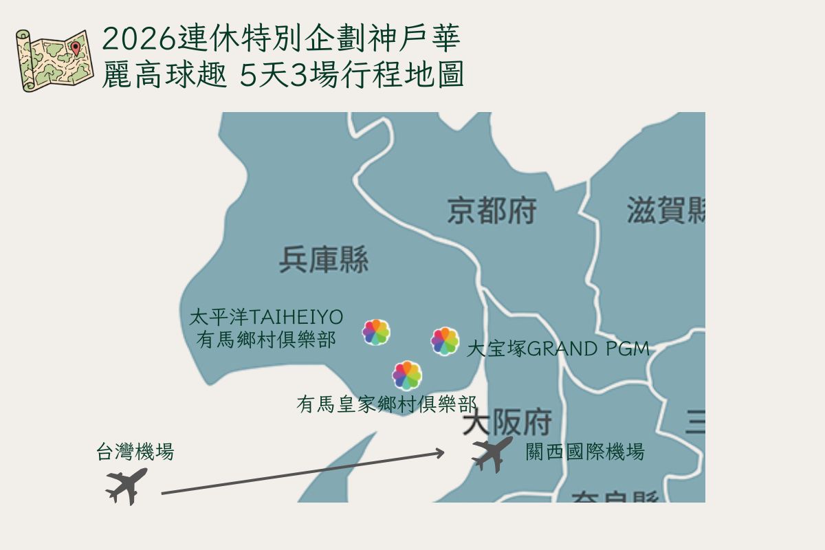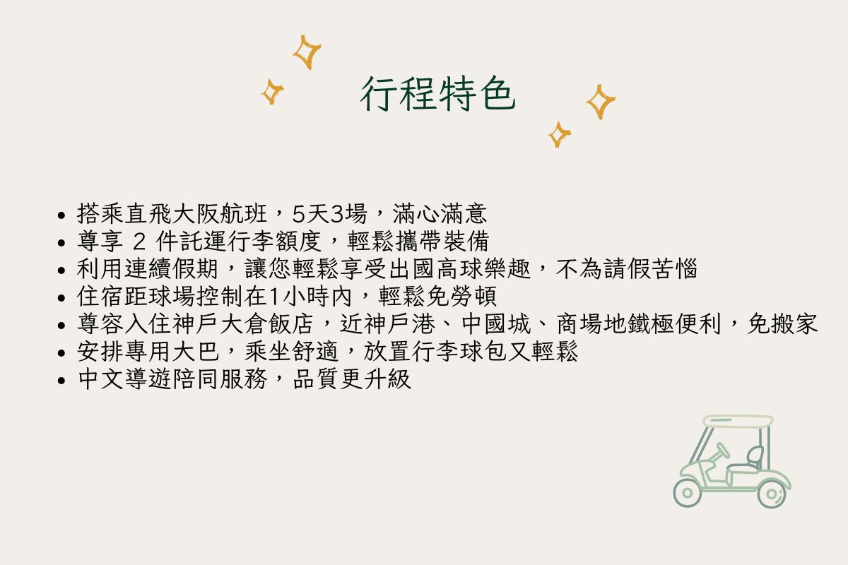 第三天我們將前往有馬皇家鄉村俱樂部享受揮桿樂趣。飯店與球場距離約 30 公里,專車車程約 40 分鐘。提醒您出發前請記得攜帶盥洗包,以便在球場運動後梳洗更換,晚間則續住神戶大倉酒店休息。